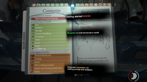 This book is your saviour, treasure all information and knowledge you find within it, oh and it also acts as your tutorial and tells you how to build shelters, fires, cook etc. You can even place these things down where you want them before you have the right equipment to build them on the screen, saves going back and forward into the inventory screen, again a nice touch. Within your inventory is a crafting mat, as you hover over the items in your inventory it tells you if you can combine them, but doesn’t tell you what with, similar to Dead Rising, again a really good thing to have.