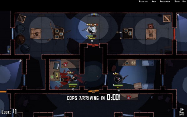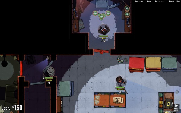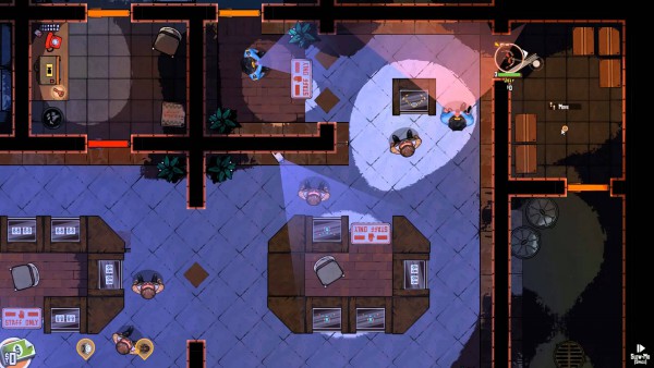 Gameplay is the major factor for this game and it’s done very well. From the start you get a tutorial that shows you all of the interesting things the game can do, from cones of vision to how the security guards use the cameras to aid them, this tutorial will show you everything you need to know in order to pull off your first heist. The levels also have great progression, there is nothing too complicated in the first few levels and its only when you hit the jewellery store that you can really stretch out the tactical side of things. The tactics in this game can be as simple or as complicated as your imagination allows, you can control each character individually through point and click control, which can be clunky at times especially because you’re in such close quarters a lot of the time. However it does make taking hostages easier.