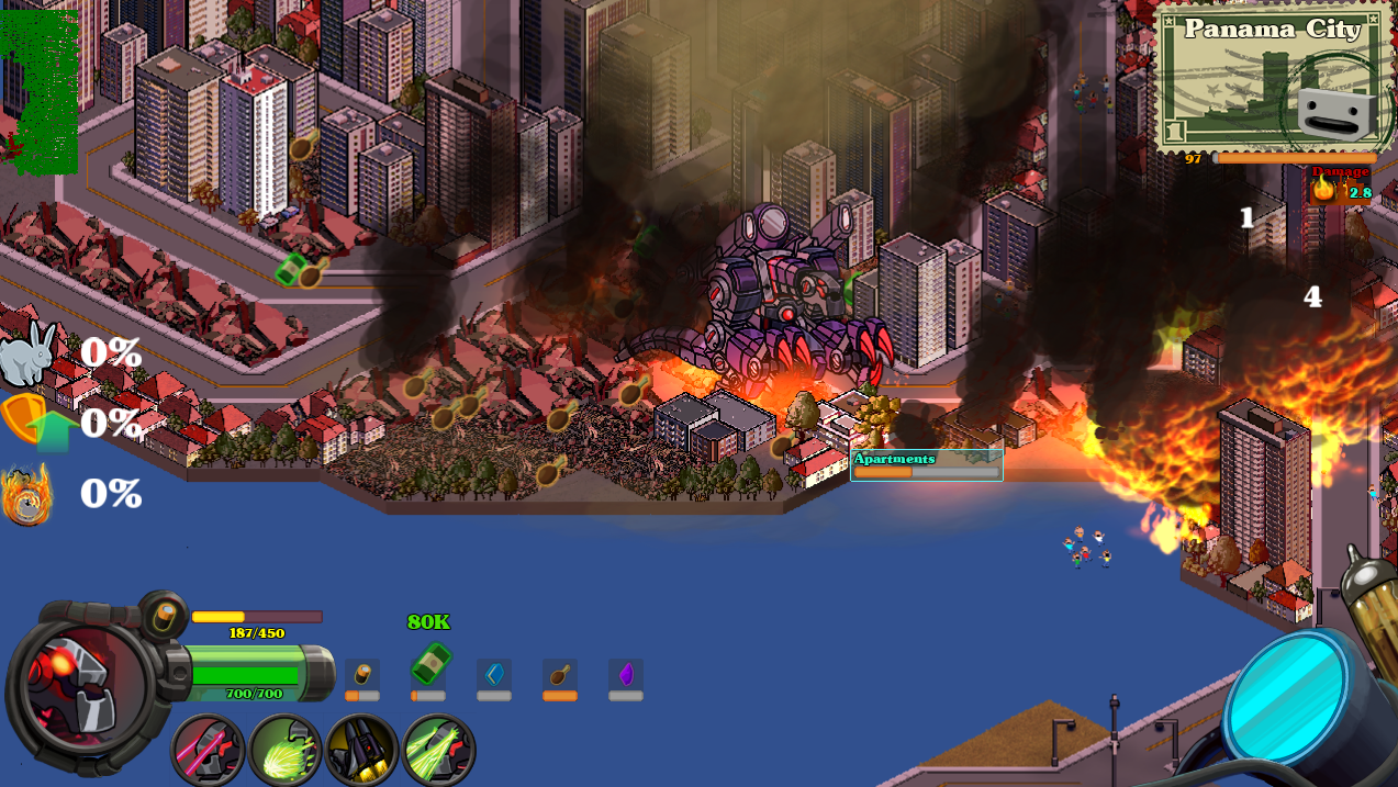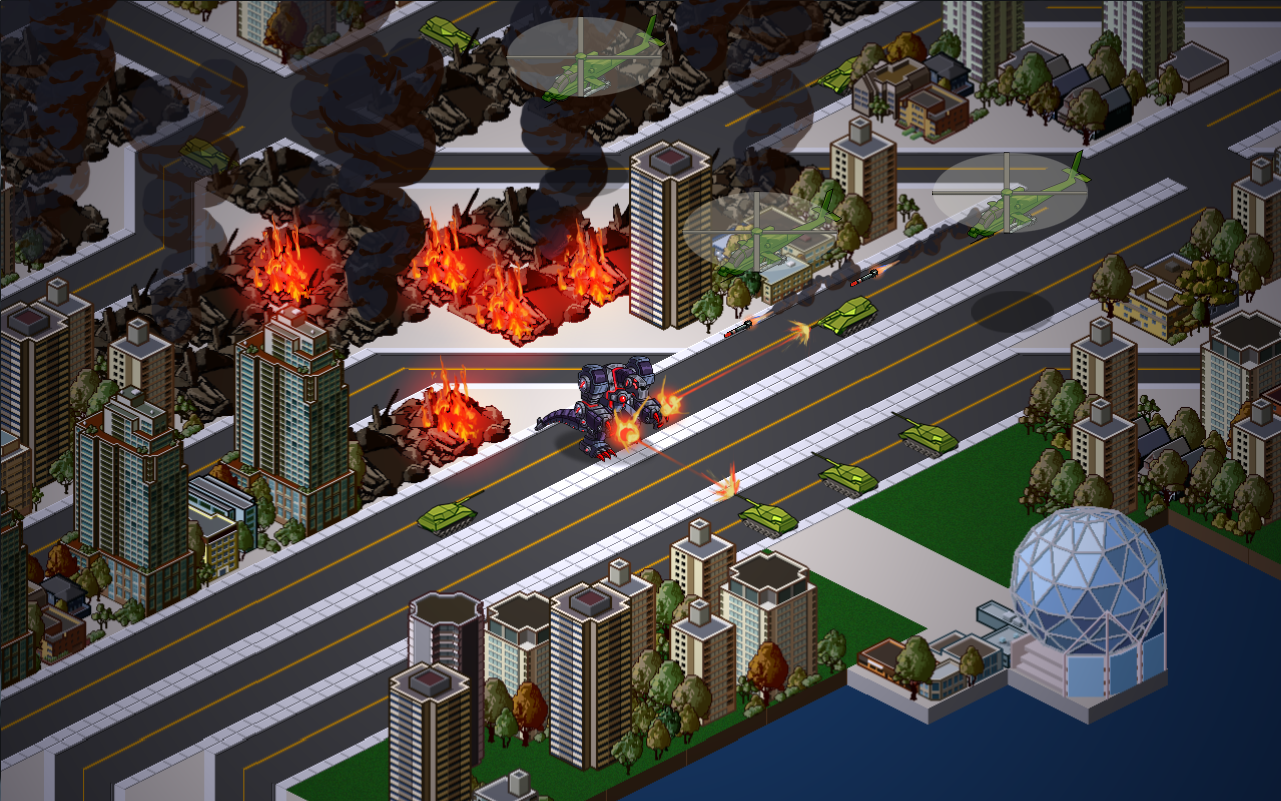 I think that everyone has a soft spot for Godzilla, right? The appetite for destruction, creative monster attacks; it’s so cathartic and enjoyable.There doesn’t seem to be any real Kaiju simulator, but Kaiju-A-GoGo by Kerberos Productions will hopefully wet your appetite. You play as a mad scientist bent on world domination, sending out his giant robot to conquer cities and create destruction. Your aim is to destroy enough of the city to make them surrender, while dealing with the military’s attempts to stop you. As time goes on you start building up your base, generating more and more resources, thus allowing you to upgrade your mech with new weapons and systems, using resources collected during your missions.
